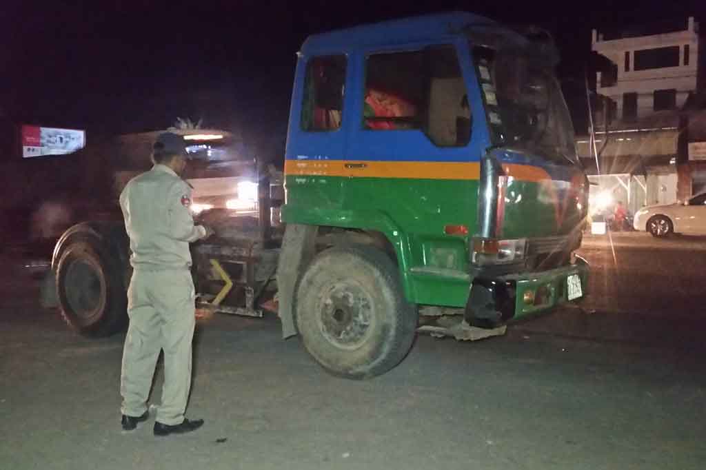 ភ្នំពេញ ៖ បើករ៉ឺម៉កដឹកកម្មករសំណង់៨នាក់គេចពីម៉ូតូមួយគ្រឿងត្រូវរថយន្តកុងតឺន័រ២ គ្រឿងបុកនិង កិនធ្វើឲ្យម៉ូតូដាច់ចេញពីគ្នាខូចខាតទាំងស្រុងបណ្តាលឲ្យរងរបួសធ្ងន់២ នាក់និងស្រាល៦​នាក់ កាលពីវេលាមោង​០៨និង២៥នាទីយប់ថ្ងៃ១៣ខែកុម្ភៈ ឆ្នាំ២០១៧ នៅតាមបណ្តោយផ្លូវជាតិលេខ៤នៅចំនុចមុខក្រុមហ៊ុនកាត់ដេរសំលៀកបំពាក់ឃូឃូសង្កាត់កន្ទោកខណ្ឌពោធិ៍សែនជ័យ។