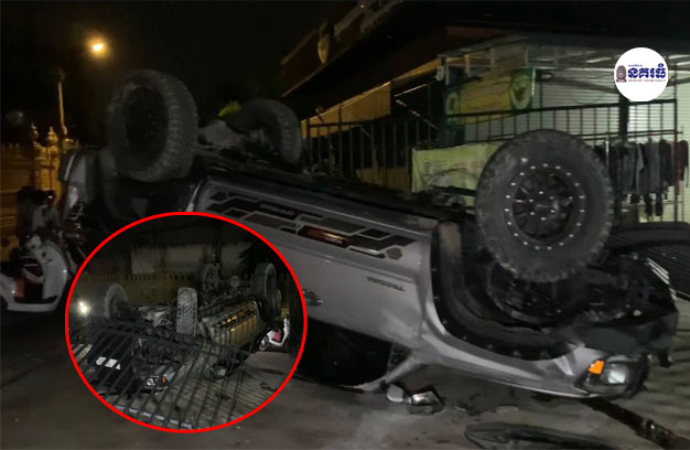 ភ្នំពេញ ៖ បុរស៣នាក់ ទើបនឹងចេញពីស៊ីផឹកស្រវឹងធ្លាក់ភ្នែក ឡើងបើករថយន្ត ១គ្រឿង ក្នុងល្បឿនលឿន ខ្វះការប្រុងប្រយ័ត្ន ខណៈដល់ផ្លូវកោង មិនបង្អង់ល្បឿន និងជាន់ហ្វ្រាំងមិនជាប់ ធ្វើឱ្យជ្រុលទៅបុករះបង្គោលស្លាក សញ្ញាចរាចរណ៍ និងរបងផ្ទះប្រជាពលរដ្ឋ រងការខូចខាត ចំណែករថយន្តបង្កហេតុ ក្រឡាប់ផ្ងារជើង សំណាងល្អ មិនបង្កឱ្យអ្នកជិះក្នុងរថយន្តរងរបួសធ្ងន់ឡើយ។