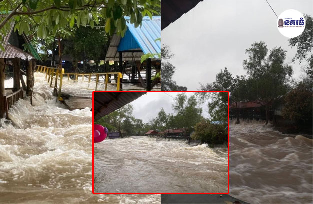 ខេត្តព្រះសីហនុ ៖ ជំនន់ទឹកភ្លៀង បានហក់ឡើងខ្ពស់ បណ្តាលឱ្យតូបលក់ដូររបស់បងប្អូនអាជីវករ នៅផ្នែកខាងក្រោម និងរមណីយដ្ឋានទឹកធ្លាក់ក្បាលឆាយ ខេត្តព្រះសីហនុ មានការជន់លិច មិនអាចលក់ដូរបានឡើយ ដោយសារទឹកហូរកាត់ផ្លូវ និងតូបលក់ដូរ។