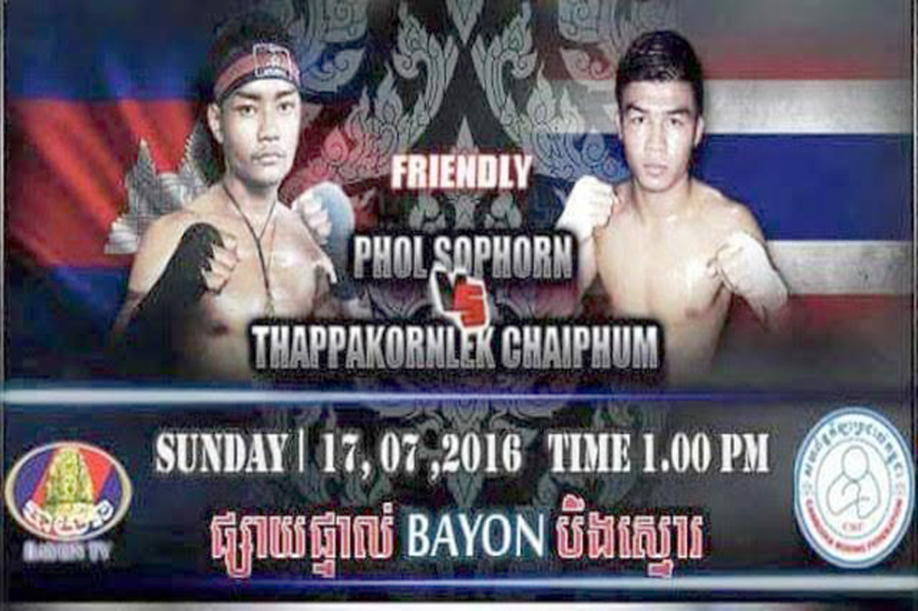 ភ្នំពេញ ៖ កីឡាករជើងខ្លាំងផល សោភ័ណ្ឌ អ្នកប្រដាល់របស់ក្លឹបតាឡីដំរីមានរិទ្ធ បន្ទាប់ពីបានគ្រងខ្សែក្រវាត់ទម្ងន់៦៣.៥គីឡូក្រាម កាលពីពេលថ្មីៗនេះមក បានបើកផ្លូវស្វាគមន៍ឲ្យកីឡាករថៃឈ្មោះ Thampakorn Lek.Chaiphum ដែលធ្លាប់ចាញ់ដោយសន្លប់ក្នុងទឹកទី៣ កាលពីពេលកន្លងមក ជួបសងសឹក នៅលើសង្វៀនបាយ័នបឹងស្នោ នារសៀលថ្ងៃអាទិត្យ ទី១៧ ខែកក្កដា ឆ្នាំ២០១៦ នេះម្តងទៀត។