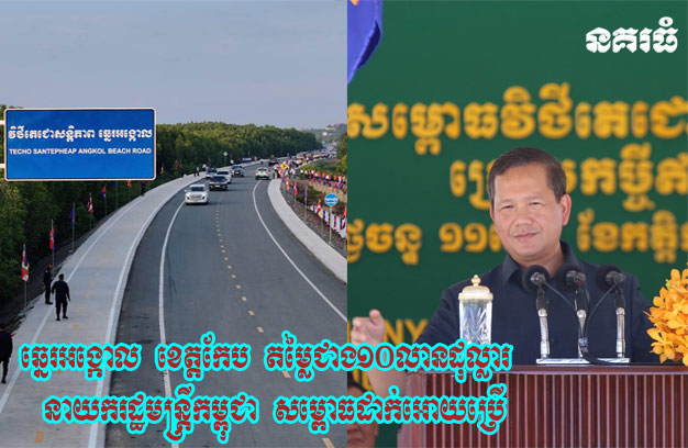 ភ្នំពេញ ៖ នៅព្រឹកថ្ងៃទី១១ ខែវិច្ឆិកា ឆ្នាំ២០២៤ សម្តេចហ៊ុន ម៉ាណែត នាយករដ្ឋមន្ត្រី នៃព្រះរាជាណាចក្រកម្ពុជា បានអញ្ជើញសម្ពោធដាក់ឱ្យប្រើប្រាស់ វិថីតេជោសន្តិភាព ឆ្នេរអង្កោល ប្រវែងសរុប ១២ ៦៤៥ម៉ែត្រ ស្ថិតនៅភូមិកែប និងភូមិអង្កោល ឃុំអង្កោល ស្រុកដំណាក់ចង្អើរ ខេត្តកែប ជាសមិទ្ធផលលើដីខេត្តកែប តម្លៃជាង១០លានដុល្លារ ។