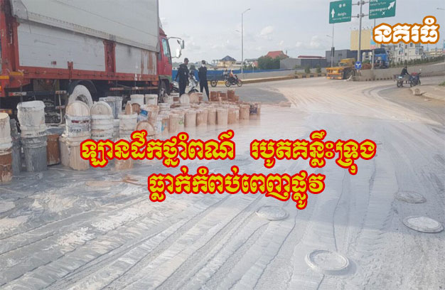 ភ្នំពេញ ៖ រថយន្តឃ្លុបដឹកទំនិញ មួយគ្រឿង អ្នកបើកបរធ្វេសប្រហែសក្នុងការដឹកជញ្ជូន កំពុងតែបើកបរ ស្រាប់តែរបូតគន្លឹះទ្រុង បណ្តាលឱ្យធ្លាក់ធុងថ្នាំរាប់រយធុង កំពប់ចាក់ថ្នាំពណ៌ក្រាលពេញផ្លូវ តែមិនបង្កឱ្យអ្នកណារងរបួស គ្រាន់តែធ្វើចរាចរណ៍ឆ្លងកាត់មិនកើត។