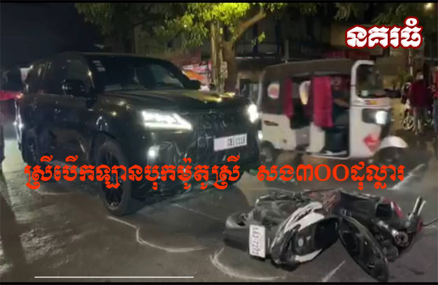 ភ្នំពេញ ៖ នារីវ័យក្មេងម្នាក់ បើករថយន្តទំនើប ១គ្រឿង ដោយខ្វះការប្រុងប្រយ័ត្ន ដល់ផ្លូវបំបែកជាបួន បានជ្រុលទៅបុកម៉ូតូ ១គ្រឿង ដែលជិះដោយនារីម្នាក់ បណ្តាលឱ្យដួលរងរបួស និងខូចខាតម៉ូតូ។