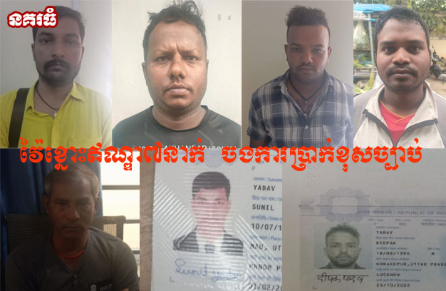 ជនសង្ស័យទាំង៧នាក់ ដែលត្រូវសមត្ថកិច្ចចាប់ឃាត់ខ្លួន រួមមាន ទី១-ឈ្មោះឈ្មោះ MANOJ ភេទប្រុស អាយុ៤៨ឆ្នាំ កាន់លិខិតឆ្លងដែនលេខ V1454167 ស្នាក់នៅបុរីគ្រីស្តាល់ ស្ថិតនៅភូមិព្រែកសំរោង៣ សង្កាត់តាខ្មៅ ក្រុងតាខ្មៅ។ ទី២-ឈ្មោះ YADAV DEEPAK ភេទប្រុស អាយុ២៨ឆ្នាំ កាន់លិខិតឆ្លងដែនលេខ W4154379 ស្នាក់នៅបុរីគ្រីស្តាល់ ស្ថិតនៅភូមិព្រែកសំរោង៣ សង្កាត់តាខ្មៅ ក្រុងតាខ្មៅ។ ទី៣-ឈ្មោះ CHAKRABORTY SUMANTA ភេទប្រុស (ព្រះសង្ឃ) អាយុ៣៦ឆ្នាំ កាន់លិខិតឆ្លងដែនលេខ Z7488128 ស្នាក់នៅបុរីគ្រីស្តាល់ ស្ថិតនៅភូមិព្រែកសំរោង៣ សង្កាត់តាខ្មៅ ក្រុងតាខ្មៅ។ ទី៤-ឈ្មោះ YADAV SUNIL ភេទប្រុស អាយុ៣០ឆ្នាំ កាន់លិខិតឆ្លងដែនលេខ Z7665758 (ជាមេខ្លោង) ស្នាក់នៅរាជធានីភ្នំពេញ។ ទី៥-ឈ្មោះ LAKHANDAR ភេទប្រុស អាយុ៣២ឆ្នាំ មុខរបរ លក់ឆ្នាំងបាយអគ្គិសនី មុង-ភួយ គ្មានសៀវភៅការងារជនបរទេស ស្នាក់នៅបន្ទប់ជួលភូមិព្រែកហូរលិច សង្កាត់ព្រែកហូរ ក្រុងតាខ្មៅ។ ទី៦-ឈ្មោះ NISHAD GOLU ភេទប្រុស អាយុ២៦ឆ្នាំ មុខរបរលក់ឆ្នាំងបាយអគ្គិសនី មុង-ភួយ មានសៀវភៅការងារជនបរទេស ស្នាក់នៅបន្ទប់ជួលភូមិព្រែកហូរលិច សង្កាត់ព្រែកហូរ ក្រុងតាខ្មៅ និងទី៧-ឈ្មោះសាហានី ប្រីជេស Sahani Brijesh ភេទប្រុស អាយុ៣០ឆ្នាំ ស្នាក់នៅផ្ទះជួលភូមិព្រែកកើត សង្កាត់ព្រែកហូរ ក្រុងតាខ្មៅ។