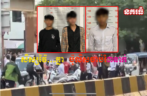 ភ្នំពេញ ៖ ក្មេងប្រុសជាសិស្សសាលា ១ក្រុម បានធ្វើសកម្មភាពដេញវាយតប់គ្នាផ្អើលពេញមុខវិទ្យាល័យជាស៊ីម សន្ធរម៉ុក ត្រូវបានសមត្ថកិច្ចចុះអន្តរាគមន៍ភ្លាមៗ ដោយឃាត់ខ្លួន ៣នាក់ យកទៅអប់រំណែនាំ។