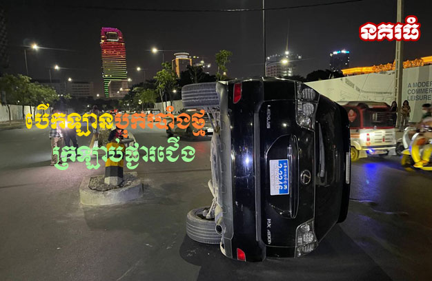 ភ្នំពេញ ៖ បុរសម្នាក់ បើករថយន្ត ១គ្រឿង ពាក់ស្លាកលេខ ខេមរភូមិន្ទ ធ្វើដំណើរក្នុងល្បឿនលឿន រួចព្យាយាមបួងចង្កូតបត់ តែមិនផុត ជ្រុលទៅបុករបាំងថ្មពុះចែកទ្រូងផ្លូវ បណ្តាលឱ្យក្រឡាប់ផ្ងារជើង។