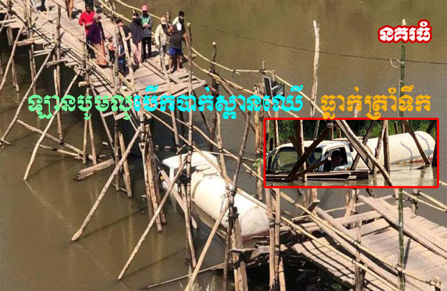 ខេត្តព្រៃវែង ៖ ស្ពានឈើ មួយកន្លែង ត្រូវបានគណៈកម្មការវត្តព្រែកចង្ក្រានក្រោម និងបងប្អូនប្រជាពលរដ្ឋ សាងសង់ឆ្លងកាត់ទន្លេតូច សម្រាប់ថ្មើរជើង កង់ម៉ូតូ ឆ្លងកាត់ ស្រាប់តែត្រូវរថយន្តបូមលូ ១គ្រឿង បើកឆ្លងកាត់ បណ្តាលឱ្យបាក់ស្ពាន ធ្លាក់រថយន្តចូលក្នុងទឹក តែសំណាងល្អ មិនបង្កឱ្យមានអ្នកណារងរបួសឡើយ។