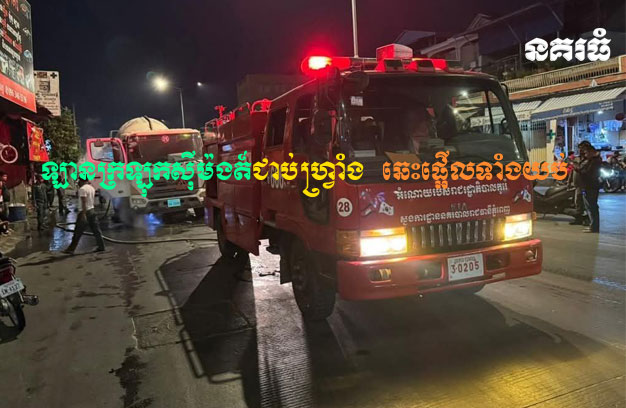 ភ្នំពេញ ៖ រថយន្តក្រឡុកស៊ីម៉ងត៍ ១គ្រឿង ខណៈបើកបរសុខៗ កើតមានអគ្គិភ័យឆាបឆេះ បណ្តាលឱ្យរងការខូចខាត និងធ្វើឱ្យភ្ញាក់ផ្អើលដល់សមត្ថកិច្ចចុះជួយអន្តរាគមបាញ់ទឹកពន្លត់អស់ ១រថយន្ត ដោយមិនបង្កគ្រោះ ថ្នាក់ដល់មនុស្សណាម្នាក់ឡើយ។