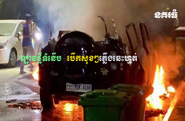 ភ្នំពេញ ៖ រថយន្តទំនើប ១គ្រឿង បើកសុខៗ មកដល់មុខផ្ទះ ស្រាប់តែឆ្លងចរន្តភ្លើង បង្កជាអគ្គិភ័យឆេះសន្ធោ សន្ធៅ ផ្អើលពលរដ្ឋទាក់ទងហៅរថយន្តពន្លត់អគ្គិភ័យ អន្តរាគមន៍បាញ់ទឹកពន្លត់ភ្លាមៗ តែហួសពេលទៅហើយ ដោយភ្លើងបានឆេះបំផ្លាញឡានទាំងមូលអស់ទាំងស្រុងទៅហើយ។