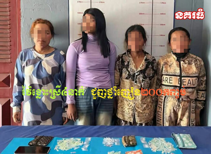 ខេត្តប្តាត់ដំបង ៖ ស្ត្រី ចំនួន៤នាក់ ជាមុខសញ្ញាជួញដូរគ្រឿងញៀន ដោយខុសច្បាប់ ត្រូវបាន កម្លាំងអាវុធហត្ថស្រុកសំពៅលូន ចុះបង្ក្រាប ដោយឃាត់ខ្លួន និងដកហូតបានវត្ថុតាងជាក់ស្តែង ថ្នាំញៀន សរុបចំនួន២២៧ កញ្ចប់ មានទម្ងន់សរុបជិតកន្លះគីឡូក្រាម។