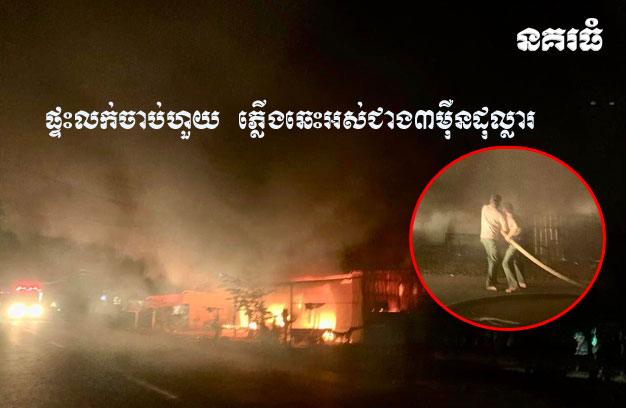 ខេត្តត្បូងឃ្មុំ ៖ ផ្ទះលក់ចាប់ហួយ មួយកន្លែង ត្រូវបានអគ្គិភ័យឆាបឆេះយ៉ាងសន្ធោសន្ធៅ ទាំងយប់ ដោយបំផ្លាញអស់ទាំងផ្ទះ និងអីវ៉ាន់ចាប់ហួយទាំងស្រុង ក្នុងទំហំទឹកប្រាក់ប្រមាណ ជាង៣ម៉ឺន៥ពាន់ដុល្លារ។ហេតុការណ៍អគ្គិភ័យនេះ បានកើតឡើងកាលពីវេលាម៉ោង ១០និង០៥នាទីយប់ ថ្ងៃទី២៤ ខែកុម្ភៈ ឆ្នាំ២០២៥ នៅចំណុចផ្ទះលក់ចាប់ហួយ ១កន្លែង ស្ថិតក្នុងភូមិប្រធាតុ ឃុំស្រឡប់ ស្រុកត្បូងឃ្មុំ។