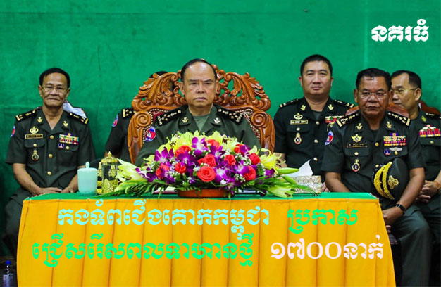 ភ្នំពេញ ៖ គណៈកម្មការជ្រើសរើសយុវជនស្ម័គ្រចិត្ត បំពេញក្របខ័ណ្ឌកងទ័ពជើងគោក នៃកងទ័ពជើងគោក បានចេញសេចក្តីជូនដំណឹងស្តីពីការជ្រើសរើសពលទាហានថ្មី ចំនួន ១៧០០នាក់ ដើម្បីបំពេញក្របខ័ណ្ឌឱ្យកងទ័ពជើងគោក ។