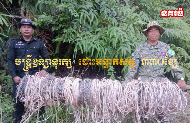 ខេត្តកោះកុងៈ អន្ទាក់ចាប់សត្វព្រៃ ចំនួន៣៣០ខ្សែ ត្រូវបានមន្ត្រីឧទ្យានុរក្ស និងកម្លាំងកងរាជអាវុធហត្ថខេត្តកោះកុង ដើរដោះនិងប្រមូលបានពីក្នុងព្រៃ នៃដែនជម្រកសត្វព្រៃ តាតៃ ស្ថិតនៅភូមិកោះប៉ោ ឃុំប៉ាកខ្លង ស្រុកមណ្ឌលសីមា ខេត្តកោះកុង។