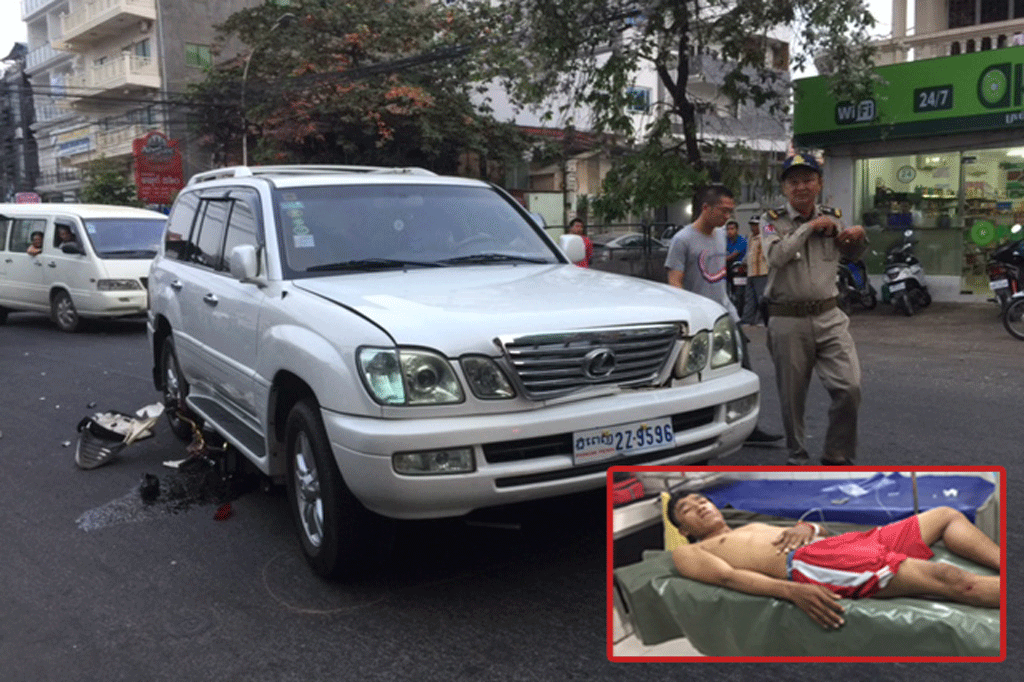 ភ្នំពេញ : មានករណីគ្រោះថ្នាក់ចរាចរណ៍ទាំងព្រឹកព្រលឹមរវាងរថយន្តលុចសីុសពណ៍សពាក់ស្លាក លេខភ្នំពេញ២Z ៩៥៩៦បើកបរដោយបុរសជាមន្រ្តីរាជការម្នាក់ហើយជ្រុលទៅបុកមូ៉តូMSXពណ៍ស ពាក់ស្លាកលេខភ្នំពេញ១FO ៤៤៥៩ហើយបណ្ដាលម្ចាស់មូ៉តូបើុយចេញពីមូ៉តូនិងមូ៉តូចូល ក្រោមរថយន្តបណ្ដាលអោយបុរសអ្នកបើកមូ៉តូរងរបួសត្រូវរថយន្តសង្រ្គោះឯកជនមកយកទៅព្យាបាល កាលម៉ោង៦និង៣០នាទីព្រឹកថ្ងៃទី២៣ ខែ កុម្ភះ ឆ្នាំ ២០១៧នៅចំណុចផ្លូវ៣៦០កែងនិងផ្លូវ១០៥ សង្កាត់បឹងកេងកងទី៣ ខណ្ឌចំការមន រាជធានីភ្នំពេញ ។
