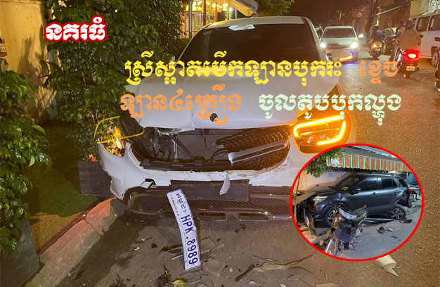 ភ្នំពេញ ៖ នារីវ័យក្មេងម្នាក់ បើករថយន្តទំនើប ១គ្រឿង ក្នុងល្បឿនលឿន រួចជ្រុលបុករះរថយន្ត ចំនួន៤គ្រឿង ដែលចតស្ងៀមលើចិញ្ចើមផ្លូវ រួចជ្រុលចូលតូបបុកល្ហុង ១កន្លែង បណ្តាលឱ្យរងការខូចខាតធ្ងន់។