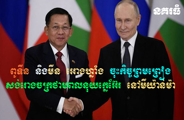 ម៉ូស្គូ (រុស្ស៉ី) ៖ លោក វ្ល៉ាឌីមៀរ ពូទីន (Vladimir Putin) ប្រធានាធិបតីរុស្ស៊ី បានស្វាគមន៍មេដឹកនាំយោធាមីយ៉ាន់ម៉ា លោកមីន អោងហ្លាំង (Min Aung Hlaing) ទៅកាន់វិមានក្រឹមឡាំង ពិភាក្សាគ្នាយ៉ាងរីករាយ បន្តជោគជ័យនៃការទូត ជាមួយនឹងការចុះហត្ថលេខាក្នុងកិច្ចព្រមព្រៀងសាងសង់រោងចក្រថាមពលនុយក្លេអ៊ែរ តូចមួយ ក្នុងប្រទេសមីយ៉ាន់ម៉ា។