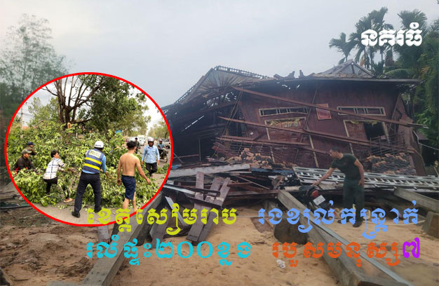 ខេត្តសៀមរាប ៖ កាលពីរសៀលថ្ងៃទី១៦ ខែមីនា ឆ្នាំ២០២៥ ខេត្តសៀមរាប បានទទួលរងនូវឧបទ្ទេវហេតុគ្រោះធម្មជាតិ ភ្លៀងខ្យល់កន្ត្រាក់ និងរន្ទះបាញ់ នៅស្ទើរគ្រប់ក្រុង-ស្រុកទូទាំងខេត្តសៀមរាប ដែលធ្វើឱ្យប៉ះពាល់ដល់ផ្ទះសម្បែងរបស់ប្រជាពលរដ្ឋ ប្រមាណជិត ២០០គ្រួសារ និងបណ្តាលឱ្យបាក់ដើមឈើ ជាច្រើនកន្លែង ក្នុងនោះក៏បានសង្កត់មនុស្ស ឱ្យរងរបួសផងដែរ។