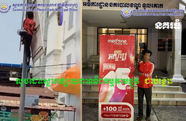 ភ្នំពេញ ៖ ជនសង្ស័យម្នាក់ បានធ្វើសកម្មភាពលួចយកដោះយកដែកស្លាកយីហោ ផ្សព្វផ្សាយពាណិជ្ជកម្ម នៅតាមផ្លូវសាធារណៈ ទាំងកណ្តាលថ្ងៃ និងត្រូវបានប្រជាពលរដ្ឋអ្នកដំណើរថតបានសកម្មភាព បង្ហោះតាមបណ្តា ញសង្គម ទីបំផុតត្រូវកម្លាំងសមត្ថកិច្ចជំនាញធ្វើការ ស្រាវជ្រាវឃាត់ខ្លួនបាន នាំយកមកចាត់ការតាមច្បាប់។