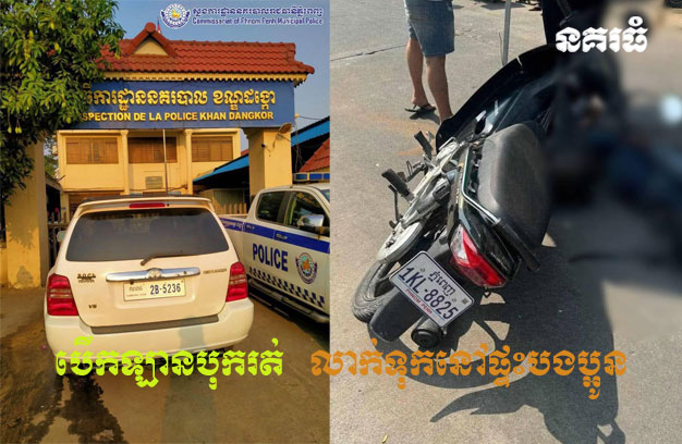 ភ្នំពេញ ៖ បុរសម្នាក់ បានបើករថយន្ត ១គ្រឿង បុកបុរសអ្នកជិះម៉ូតូម្នាក់ បណ្តាលឱ្យរងរបួសធ្ងន់ ហើយភ្លាមៗនោះ អ្នកបើកបរបានបើករថយន្តគេចបាត់ ។ លុះ១ថ្ងៃក្រោយមក សមត្ថកិច្ចបានស្រាវជ្រាវរកឃើញរថយន្តបង្កហេតុ ដែលបើកយកទៅលាក់ទុកនៅឯផ្ទះបងប្អូន ប៉ុន្តែជនបង្កហេតុ បានរត់គេចខ្លួនបាត់។