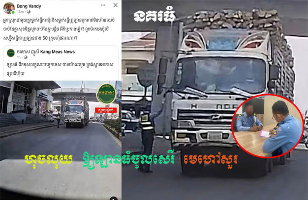 ភ្នំពេញ ៖ មន្ត្រីនគរបាលចរាចរណ៍ម្នាក់ ដែលបែកធ្លាយវីដេអូហុចដៃយកលុយពីរថយន្តធុនធំ ដឹកអុស  ១គ្រឿង នៅគោលដៅស្តុបស្ពានអាកាសផ្សារដីហុយ បើកផ្លូវឲ្យរថយន្តធំចេញចូលក្នុងរាជធានី បានដោយសេរី ទាំងក្នុងពេលម៉ោងហាមឃាត់នោះ ត្រូវបានលោកឧត្តមសេនីយ៍ឯក ជួន ណារិន្ទ អគ្គស្នងការរង និងជាស្នងការនគរ បាលរាជធានីភ្នំពេញ បញ្ជាឱ្យនាយការិយាល័យនគរបាលចរាចរណ៍ផ្លូវគោក ស្រាវជ្រាវអញ្ជើញមន្ត្រីនោះ មកសាកសួរនាំនៅការិយាល័យនគរបាលចរាចរណ៍ផ្លូវគោក កាលពីថ្ងៃទី៣ ខែមេសា ឆ្នា២០២៥។