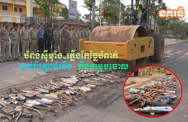 ខេត្តសៀមរាប ៖ បំពង់ស៊ីម៉ាំង និងភ្លើងហ្វាកែច្នៃខុសបច្ចេកទេស បំពាក់រថយន្តនិងម៉ូតូ ប្រមាណ៣០០គ្រឿង ដែលសមត្ថកិច្ចចាប់ដកហូតពីក្រុមក្មេងទំនើង នាពេលកន្លងទៅ ត្រូវបានសមត្ថកិច្ចនៃស្នងការដ្ឋាននគរបាលខេត្តសៀមរាប កិនកម្ទេចចោល កាលពីព្រឹកថ្ងៃទី៨ ខែមេសា ឆ្នាំ២០២៥  នៅមុខស្នងការដ្ឋាននគរបាលខេត្តសៀមរាប។