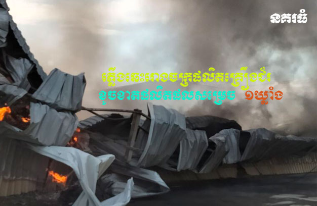 ខេត្តតាកែវ ៖ ឃ្លាំងស្តុកអីវ៉ាន់ផលិតផលសម្រេច ពីគ្រឿងជ័រប្លាស្ទិក នៅរោងចក្រ ហុងហ្វា ប្លាស្ទិក ត្រូវបានអគ្គិភ័យឆាបឆេះអស់ទាំងស្រុង ចំនួន១អគារ ក្នុងចំណោម ៣អគារ បង្កឱ្យមានការភ្ញាក់ផ្អើលដល់សមត្ថកិច្ច បញ្ជូនរថយន្តពន្លត់អគ្គិភ័យចេញអន្តរាគមន៍ភ្លាមៗ។