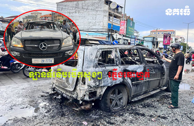 រថយន្តដែលត្រូវភ្លើងឆេះ ម៉ាក Mercedes Benz ពណ៌ខ្មៅ ពាក់ស្លាកលេខ ភ្នំពេញ 2V-7774 បើកបរនិងរួមដំណើរដោយជនជាតិចិន ចំនួន២នាក់។