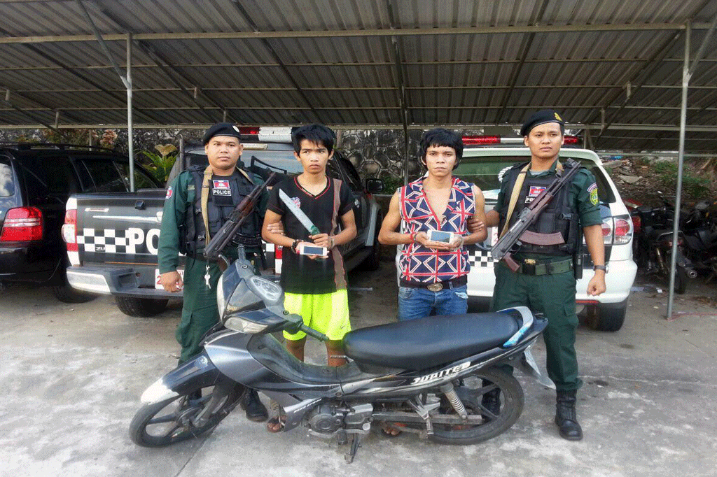 ខេត្តព្រះសីហនុ ៖ ជនសង្ស័យចំនួន២នាក់ ដែលជាមុខសញ្ញាតែងធ្វើសកម្មភាពភ្ជង់កាំបិត គំរាមប្លន់ភ្ញៀវទេសចរនៅពេលយប់ យ៉ាង សកម្មក្នុងក្រុងព្រះសីហនុ ត្រូវបានសមត្ថកិច្ច ស្រាវជ្រាវចាប់ឃាត់ខ្លួនបាន កាលពីថ្ងៃទី២៧ ខែកុម្ភៈ ឆ្នាំ២០១៧ បន្ទាប់ពីជនសង្ស័យទាំង ២នាក់ បានភ្ជង់ប្លន់ទូរស័ព្ទ ព្រមទាំងទ្រព្យសម្បត្តិ ពីនារីរងគ្រោះចំនួន២នាក់ កាលពីយប់ថ្ងៃទី២៥ ខែកុម្ភៈ ឆ្នាំ២០១៧ នៅចំណុចភូមិ៥ សង្កាត់ លេខ៤ ក្រុងព្រះសីហនុ។
