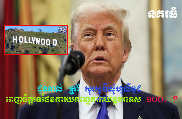 សហរដ្ឋអាមេរិក ៖ លោក ដូណាល់ ត្រាំ (Donald Trump) ប្រធានាធិបតីសហរដ្ឋអាមេរិក បានសួរយោបល់ស្ទូឌីយ៉ូភាពយន្តហូលលីវូដ (Hollywood Film Studio) ថាតើអ្នកពេញចិត្តនឹងផែនការកំណត់ពន្ធ ១០០% លើភាពយន្តបរទេសនាំចូលឬទេ? ដោយលោកត្រាំ ក៏បានសង្កត់ធ្ងន់ថា លោកចង់ជួយវិស័យភាពយន្តសហរដ្ឋអា មេរិក។