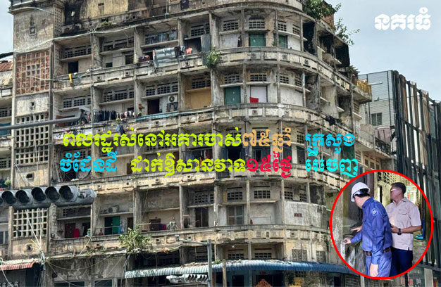 ភ្នំពេញ ៖ ក្រសួងរៀបចំដែនដី នគរូបនីយកម្ម និងសំណង់ បានជូនដំណឹងដល់ប្រជាពលរដ្ឋចំនួន ៤គ្រួសារ ដែលកំពុងស្នាក់នៅក្នុងអគារសហកម្មសិទ្ធិ ដែលមានអាយុកាលជាង៧៥ឆ្នាំ (អតីតសណ្ឋាគារអង្គរមានជ័យ) ស្ថិតនៅកែងមហាវិថីព្រះមុនីវង្ស និងមហាវិថីកម្ពុជាក្រោម ក្នុងខណ្ឌ៧មករា ឱ្យបញ្ឈប់ការរស់នៅនិងប្រកប អាជីវកម្មជាបន្ទាន់ និងត្រូវធ្វើការចាកចេញពីអគារនេះ ក្នុងរយៈពេល១៥ថ្ងៃ ខណៈដែលសំណង់អគារនេះមានសភាពចាស់ទ្រុឌទ្រោមខ្លាំង អាចប្រឈមមុខនឹងការបាក់រលំជាយថាហេតុ បង្កគ្រោះថ្នាក់ដល់ជីវិត។