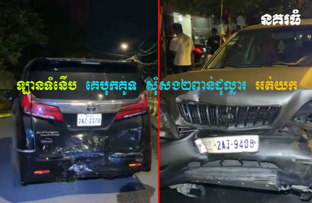 ភ្នំពេញ ៖ បុរសជាជនជាតិចិន ម្នាក់ បានបើករថយន្តទំនើប ១គ្រឿង បត់ឆ្លងផ្លូវ ស្រាប់តែត្រូវរថយន្ត ១គ្រឿង ទៀត បើកបរដោយបុរសជាជនជាតិខ្មែរ មកពីក្រោយក្នុងល្បឿនលឿន ចាប់ហ្វ្រាំងមិនទាន់ ជ្រុលបុកពេញទំ ហឹង ធ្វើឱ្យរថយន្តទំនើបជ្រុលទៅបុកខឿនផ្លូវ រងការខូចខាតយ៉ាងធ្ងន់ បន្ទាប់មកភាគីជនជាតិចិន បានទាមទារឱ្យភាគីបង្កហេតុ យករថយន្តរបស់ខ្លួនទៅជួសជុលឱ្យស្អាតដូចដើម តែភាគីបង្កហេតុ សុំសង២០០០ដុល្លារ មិនព្រម ក៏ត្រូវសមត្ថកិច្ចអូសយកទៅរក្សាទុក រង់ចាំដោះស្រាយគ្នាតាមច្បាប់។