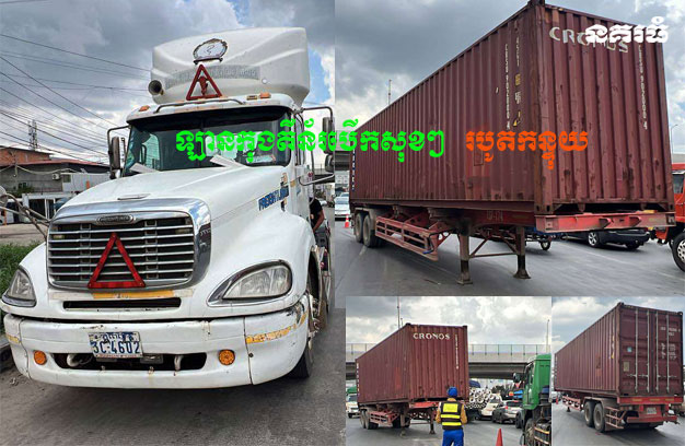 រថយន្តបង្កហេតុ ម៉ាក FRIEGHTLINER ពណ៌ស ទាំងក្បាលរថយន្ត និងកន្ទុយរ៉ឺម៉ក ពាក់ស្លាកលេខ ភ្នំពេញ 3C-4602 ដូចគ្នា និងពុំត្រូវបានគេស្គាល់ថា ជារថយន្តរបស់ក្រុមហ៊ុនផែស្ងួត ណាមួយនោះទេ។