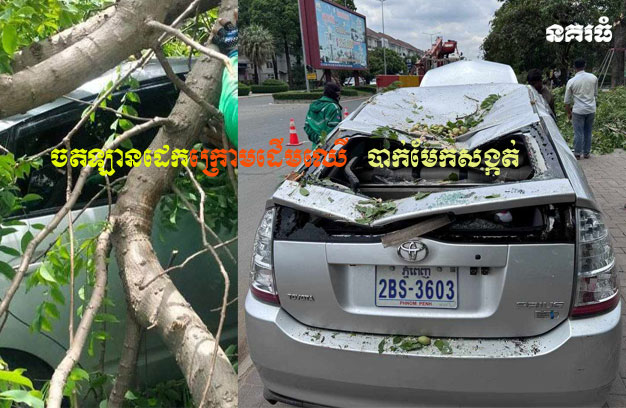 ភ្នំពេញ ៖ បុរសម្នាក់ បានបើករថយន្ត ១គ្រឿង ទៅចតនៅក្រោមដើមឈើធំ ១ដើម ដើម្បីសម្រាក លុះក្រោយមកស្រាប់តែមែកឈើ ១មែកធំ បានបាក់សង្កត់រថយន្ត បណ្តាលឱ្យខូចខាតរថយន្តយ៉ាងធ្ងន់ តែសំណាងល្អ មិនបង្កឱ្យអ្នកណាម្នាក់រងគ្រោះថ្នាក់ឡើយ។