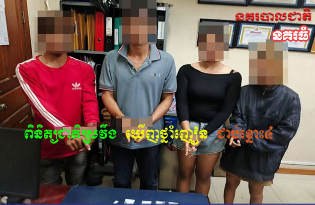 ភ្នំពេញ ៖ ជនសង្ស័យប្រុសស្រី ចំនួន៤នាក់ ជិះម៉ូតូ ២គ្រឿង ដឹកគ្នាឆ្លងកាត់គោលដៅសមត្ថកិច្ច ដែលកំពុងពិនិត្យជាតិស្រវឹង លុះសមត្ថកិច្ចឃាត់ត្រួតពិនិត្យ រកឃើញថ្នាំញៀន ចំនួន១០កញ្ចប់ ក៏ចាប់វាយខ្នោះទាំង៤នាក់ នាំយកតៅចាត់ការតាមច្បាប់។