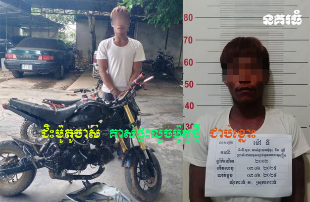 ខេត្តកណ្តាល ៖ ជនសង្ស័យម្នាក់ បានជិះម៉ូតូកញ្ចាស់ ១គ្រឿង មកឈប់ក្បែរផ្ទះទុកចោល ១កន្លែង រួចធ្វើ សកម្មភាពគាស់ទ្វារផ្ទះ លួចម៉ូតូថ្មី ១គ្រឿង និងទ្រព្យសម្បត្តិផ្សេងទៀត។ បន្ទាប់មកបានយកម៉ូតូកញ្ចាស់របស់ខ្លួន ទៅលាក់ទុកនៅក្បែគុម្ពចេក ខាងក្រោយផ្ទះជនរងគ្រោះ តែត្រូវអ្នកជិតខាងឃើញ ទូរស័ព្ទប្តឹងសមត្ថកិច្ច ចេញស្ទាក់ចាប់ក្របួចជាប់ នាំយកទៅចាត់ការតាមច្បាប់។