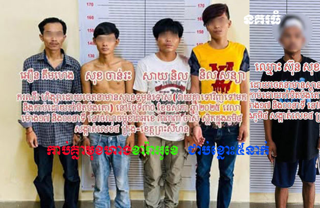 បន្ទាប់ពីទទួលបានព័ត៌មាន កម្លាំងនគរបាល បានធ្វើស្រាវជ្រាវយ៉ាងយកចិត្តទុកដាក់ ហើយនៅវេលាម៉ោង ១៧និង៤០នាទី ថ្ងៃដដែល បានឃាត់ខ្លួនជនសង្ស័យ ភេទប្រុស ចំនួន ០៥នាក់ ជាជនជាតិខ្មែរ យកមកសាកសួរ។