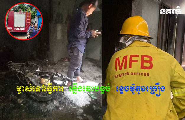 ខេត្តកណ្តាលៈ ស្ត្រីជាកម្មការិនីរោងចក្រម្នាក់ ចាក់សោបន្ទបប់ទៅធ្វើការដូចសព្វដង ដោយបានទុកម៉ូតូ ១គ្រឿង នៅក្នុងបន្ទប់ លុះពេលត្រលប់មកវិញ ក៏ប្រទះឃើញភ្លើងបានឆេះម៉ូតូខូចខាតអស់ទាំងស្រុងទៅហើយ។