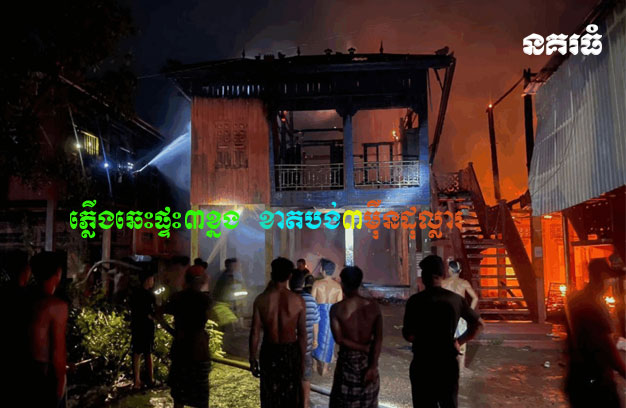 ខេត្តត្បូងឃ្មុំ ៖ លំនៅឋានរបស់ប្រជាពលរដ្ឋ ចំនួន៣ខ្នង នៅជាប់គ្នា ត្រូវបានអគ្គិភ័យឆាបឆេះរាលដាល បង្កឱ្យខូចខាតអស់ទាំងស្រុង គិតជាទំហំទឹកប្រាក់ ប្រមាណជាង ៣ម៉ឺនដុល្លារ។