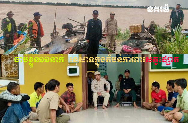 ខេត្តក្រចេះ៖ អ្នកនេសាទ ចំនួន១១នាក់ ត្រូវបានកម្លាំងសមត្ថកិច្ចចម្រុះធ្វើការឃាត់ខ្លួន បន្ទាប់ពីធ្វើសកម្មភាពនេសាទ នៅក្នុងតំបន់គ្រប់គ្រងនិងការពារសត្វផ្សោត និងជីវចម្រុះជលផល ក្នុងភូមិសាស្ត្រស្រុកចិត្របុរី ខេត្តក្រចេះ។