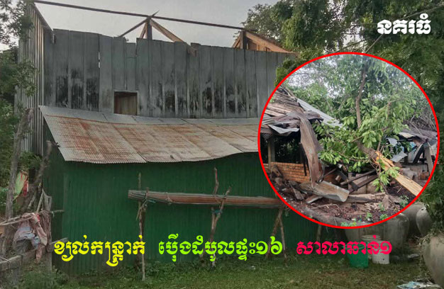 ខេត្តបាត់ដំបង ៖ ផ្ទះរបស់ប្រជាពលរដ្ឋ ១៦ខ្នង និងសាលាឆាន់ ១ខ្នង ត្រូវបានបំផ្លាញដោយខ្យល់កន្ត្រាក់វាយ ប្រហារ កាលពីល្ងាចថ្ងៃទី១៧ មិថុនាឆ្នាំ២០២៥ នៅភូមិកោះថ្កូវ ឃុំគារ ស្រុកមោងឫស្សី តែមិនបង្កឱ្យមានគ្រោះ ថ្នាក់ដល់មនុស្សនោះទេ។