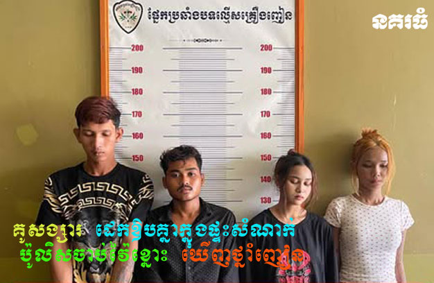 ខេត្តកំពង់ស្ពឺ ៖ ជនសង្ស័យប្រុសស្រី ២គូ ជាមុខសញ្ញាជួញដូរ និងប្រើប្រាស់នូវសារធាតុញៀនដោយខុសច្បាប់ កំពុងដេកឱបគ្នានៅក្នុងផ្ទះសំណាក់ ត្រូវបានកម្លាំងសមត្ថកិច្ចជំនាញ ស្រាវជ្រាវឃាត់ខ្លួន និងដកហូតបានវត្ថុតាង ថ្នាំញៀន ចំនួន២០កញ្ចប់។ លុះក្រោយធ្វើការសាកសួរ ក៏ឈានដល់ការឃាត់ខ្លួនបក្ខពួកថែម២នាក់ទៀត សរុបចំនួន៦នាក់ (ស្រី២)។