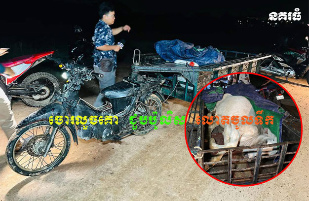 ភ្នំពេញ ៖ ជនសង្ស័យ ១ក្រុម មានគ្នា៣នាក់ បានធ្វើសកម្មភាពលួចគោ ១ក្បាល របស់បងប្អូនប្រជាពលរដ្ឋ ដឹកតាមរ៉ឺម៉ក បំណងយកទៅលក់ ស្រាប់តែជួបជាមួយកម្លាំងសមត្ថកិច្ចកំពុងល្បាត ព្យាយាមបើករត់គេច រួចទុករ៉ឺម៉កចោល ហើយនាំគ្នាលោតចូលទឹក រត់គេចខ្លួនបាត់អស់។