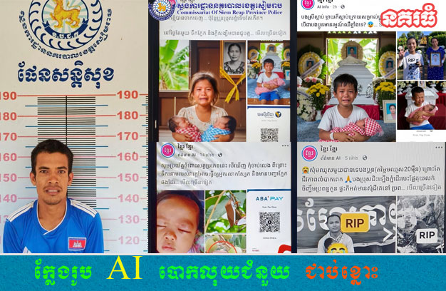 ខេត្តសៀមរាប ៖ ជនសង្ស័យម្នាក់ បានប្រើប្រាស់គណនីហ្វេសប៊ុក បង្ហោះរូបភាពកុមារកំព្រា ជនពិការ ដ៏គួរឱ្យសោកសង្រេង ដែលកំពុងត្រូវការថវិកាជំនួយពីសប្បុរសជន មកសង្គ្រោះបន្ទាន់ និងរូបភាពសុំជំនួយសម្រាប់កងទ័ព ជាដើម ដែលបង្កើតឡើងដោយបច្ចេកវិទ្យាបញ្ញាសិប្បនិម្មិត AI ត្រូវបានកម្លាំងសមត្ថកិច្ចជំនាញប្រឆាំងបទល្មើសបច្ចេកវិទ្យា ស្រាវជ្រាវឃាត់ខ្លួន នាំយកមកចាត់ការតាមច្បាប់។