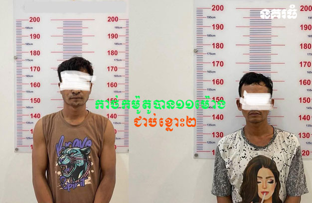 ជនសង្ស័យទាំង២នាក់ ដែលត្រូវសមត្ថកិច្ចចាប់ឃាត់ខ្លួន ទី១-ឈ្មោះមាស សារ៉ា ភេទប្រុស អាយុ២៣ឆ្នាំ (អ្នក ធ្វើសកម្មភាពកាច់កម៉ូតូ) ឃាត់ខ្លួនត្រង់ចំណុចភូមិ១០ សង្កាត់ផ្សារថ្មី ទី៣ ខណ្ឌដូនពេញ និងទី២-ឈ្មោះស៊ុំ ពិស្សី ភេទប្រុស អាយុ២៨ឆ្នាំ (អ្នកទទួលផលចោរកម្ម) ឃាត់ខ្លួនត្រង់ចំណុច សង្កាត់វាំងចាស់ ក្រុងឧត្តុង្គម៉ែជ័យ ខេត្តកំពង់ស្ពឺ។