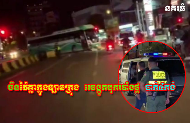 ភ្នំពេញ ៖ រថយន្តក្រុងដឹកអ្នកដំណើរ ១គ្រឿង ដឹកជនជាតិចិន ជាច្រើននាក់ មិនដឹងថាគោលដៅទៅណានោះទេ ស្រាប់តែក្រោយ មកជនជាតិចិន ដែលជិះក្នុងរថយន្តក្រុង បានផ្ទុះជម្លោះវ៉ៃតប់គ្នា រហូតធ្វើឱ្យរថយន្តក្រុងនោះ រេចង្កូតជ្រុលទៅបុករបាំងថ្មពុះចែកទ្រូងផ្លូវ បាក់អស់ ៤កង់ ស្រាប់តែភ្លាមនោះ ទាំងអ្នកបើកបរថយន្ត និងជនជាតិចិន នាំគ្នាចុះរត់ប្រសាច គេចបាត់អស់ នៅសល់តែជនជាតិចិន ម្នាក់ មិនដឹងជាមានរឿងអ្វី បែរជាកាន់អំបោសជាប់ដៃ ដេញវាយអ្នកដំណើរពេញផ្លូវទៅវិញ ទើបត្រូវសមត្ថកិច្ចចុះឃាត់ខ្លួនយកទៅសាកសួរភ្លាមៗ។