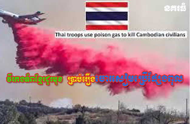 ខេត្តឧត្តរមានជ័យ ៖ វីរកងទ័ពកម្ពុជា នៅជួរមុខ បានបញ្ជាក់ថា អំឡុងពេលដែលទាហានចោរសៀមឈ្លានពាន ព្យាយាមវាយដណ្តើមកាន់កាប់ទឹកដីកម្ពុជា អស់រយៈពេល ៥យប់៥ថ្ងៃ កន្លងមកនេះ គឺសៀម បានព្យាយាមប្រើគ្រប់យុទ្ធវិធី ដោយប្រើប្រាស់ទាំងអាវុធតូចធំ គ្រាប់ផ្លោង ពិសេសថែមទាំងបានប្រើយន្តហោះទម្លាក់គ្រាប់ និងបាញ់ផ្សែងពុល មកលើកម្លាំងកងទ័ពជួរមុខកម្ពុជា ថែមទៀតផង។ យ៉ាងណា វីរកងទ័ពយើង នៅតែបន្តឈរជើង យ៉ាងរឹងមាំ នៅគ្រប់សមរភូមិ ដោយមិនអនុញ្ញាតឱ្យក្រុមចោរសៀមឈ្លានពាន រំលោភបំពានដែនអធិបតេ យ្យកម្ពុជា បានជាដាច់ខាត។