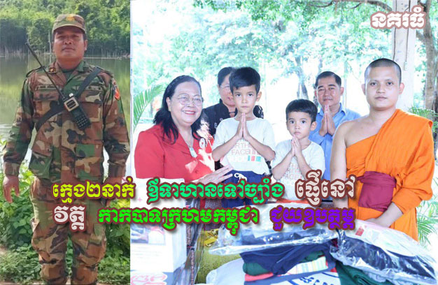 ខេត្តស្វាយរៀង ៖ ក្មេងប្រុសតូច ២នាក់បងប្អូន ក្រោយពីឪពុកម្តាយបានចែកផ្លូវគ្នា ត្រូវបានបុរសជាឪពុកដែលជាវីរៈកងទ័ពជួរមុខ មានភារកិច្ចចេញច្បាំង ការពារទឹកដី (សមរភូមិមុំបី ខេត្តព្រះវិហារ) បានសម្រេចយកកូនតូចទាំង ២នាក់ មកផ្ញើនៅវត្ត ឱ្យព្រះសង្ឃមួយអង្គ ដែលត្រូវជាឪពុកមា ឱ្យជួយមើលថែ លុះក្រោយពីទទួល ជ្រាបនូវព័ត៌មានបែបនេះ សម្តេចកិត្តិព្រឹទ្ធបណ្ឌិត ប៊ុន រ៉ានី ហ៊ុនសែន ប្រធានកាកបាទក្រហមកម្ពុជា បានចាត់ តំណាង ចុះសួរសុខទុក្ខ និងឧបត្ថម្ភក្មេងប្រុសទាំង២នាក់ ដែលកំពុងស្នាក់នៅក្នុងវត្តសន្តិភាព ខេត្តស្វាយរៀង។ក្មេងប្រុសទាំង២នាក់បងប្អូន ដែលឪពុកយកកូនមកផ្ញើនៅវត្ត ទី១-ឈ្មោះសេក ដុងហេ អាយុ៧ឆ្នាំ រៀនថ្នាក់ទី១ និងទី២-ឈ្មោះសេក ដុងហៃ អាយុ៥ឆ្នាំ មិនទាន់ដល់អាយុចូលរៀន។ ចំណែកបុរសជាឪពុក ឈ្មោះសេក សំណាង ជាវីរកងទ័ពជួរមុខ កំពុងជាប់បំពេញកាតព្វកិច្ចនៅតំបន់មុំបី ខេត្តព្រះវិហារ។