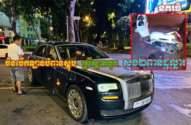 ភ្នំពេញ ៖ នារីរូបស្រស់ ចំនួន២នាក់ ជិះម៉ូតូដឹកគ្នាក្នុងល្បឿនលឿន ឆ្លងស្តុបពណ៌បៃតង ស្រាប់តែមានរថយន្តទំនើប ម៉ាក Rolls Royce ១គ្រឿង បើកបរដោយបុរសជនជាតិចិន ម្នាក់ បំពានភ្លើងស្តុបក្រហម ធ្វើឱ្យម៉ូតូគេចមិនទាន់ ជ្រុលបុកចំពាក់កណ្តាលចំហៀងខាងស្តាំរថយន្តពេញទំហឹង បណ្តាលឱ្យភាគីនារីជាអ្នកជិះម៉ូតូ រងរបួសទាំង២នាក់ ហើយក្រោយកើតហេតុ បុរសជនជាតិចិន បើករថយន្តទំនើប បានសងសំណងទៅភាគីរងគ្រោះ ចំនួន២ពាន់ដុល្លារ ដើម្បីបញ្ចប់រឿង។