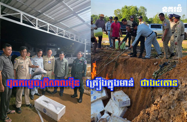 ខេត្តកំពង់ធំ ៖ ត្រីសាលម៉ុន គ្រឿងក្នុងមាន់ និងគ្រឿងឧបភោគ-បរិភោគ មួយចំនួនទៀត សរុបមានទម្ងន់ជាង៥តោន ដែលជាទំនិញមិនមានលិខិតស្នាមបញ្ជាក់ពីការនាំចូលច្បាស់លាស់ ព្រមទាំងការដឹកជញ្ជូនពុំត្រឹមត្រូវតាមបច្ចេកទេស ដែលត្រូវបានកម្លាំងសមត្ថកិច្ចជំនាញ ធ្វើការបង្ក្រាបបាន នាពេលថ្មីៗនេះ ត្រូវបានសមត្ថកិច្ចជំនាញ ដុតកម្ទេចចោល នៅព្រឹក ថ្ងៃទី២០ ខែសីហា ឆ្នាំ២០២៥។