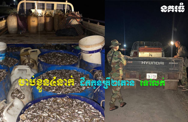 ខេត្តកំពង់ឆ្នាំង ៖ ជនសង្ស័យ ៤នាក់ ត្រូវបានកម្លាំងយោធាចាប់ខ្លួនភ្លាមៗ ក្រោយពួកគេព្យាយាមដឹកកូនត្រី ប្រមាណ២តោន ក្នុងរដូវបិទនេសាទ គោលដៅទៅលក់ឱ្យឈ្មួញ។